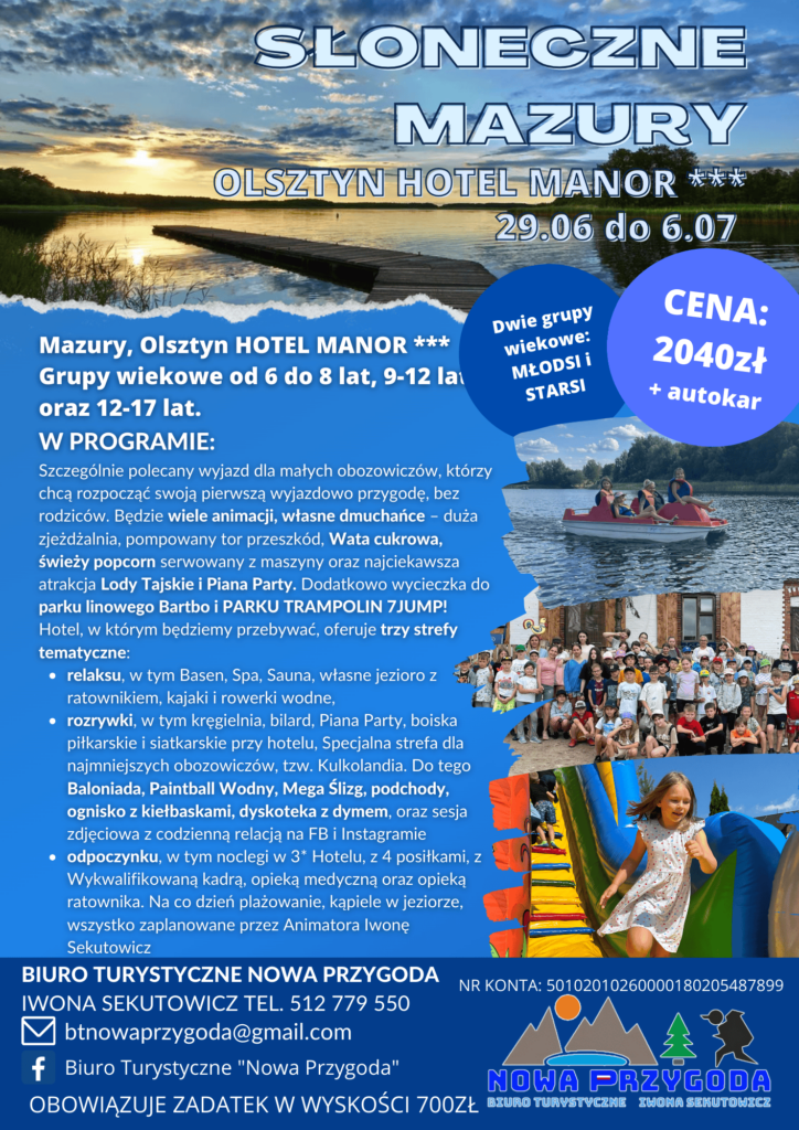 Obozy na Słonecznych Mazurach 2025 w Hotelu Manor to nie tylko doskonała zabawa, ale również czas pełen nauki, aktywności i nawiązywania przyjaźni. Dzieciaki z pewnością wrócą z mnóstwem wrażeń i wspomnień na długo!