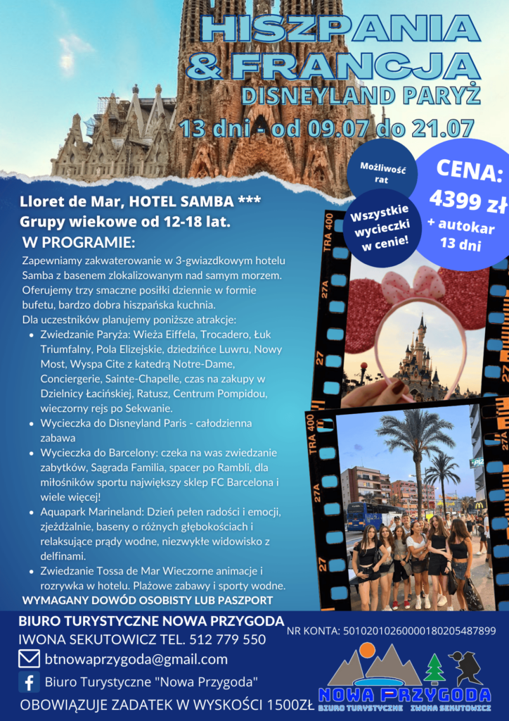 – Wycieczka do Disneyland Paris – całodzienna zabawa Wycieczka do Barcelony: czeka na was zwiedzanie zabytków, Sagrada Familia, spacer po Rambli, dla miłośników sportu największy sklep FC Barcelona i wiele więcej!– Aquapark Marineland: Dzień pełen radości i emocji, zjeżdżalnie, baseny o różnych głębokościach i relaksujące prądy wodne, niezwykłe widowisko z delfinami.